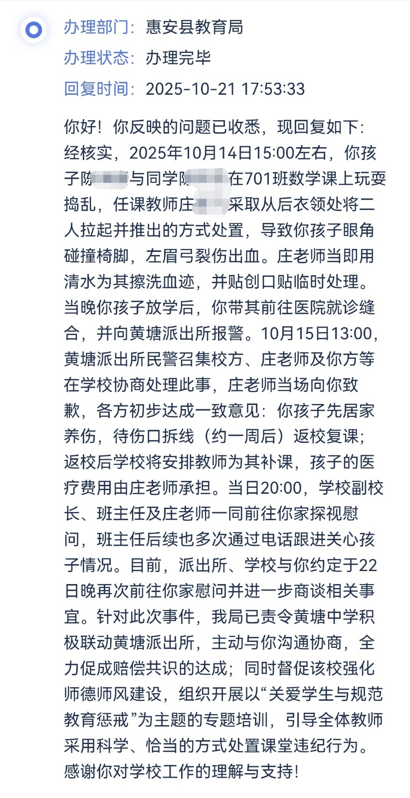 该回复称,10月15日,黄塘派出所民警召集校方、庄老师及陈先生在学校协商处理,庄老师当场致歉,各方初步达成一致意见:孩子先居家养伤,待伤口拆线(约一周后)返校复课;返校后学校将安排教师为其补课,孩子的医疗费用由庄老师承担。