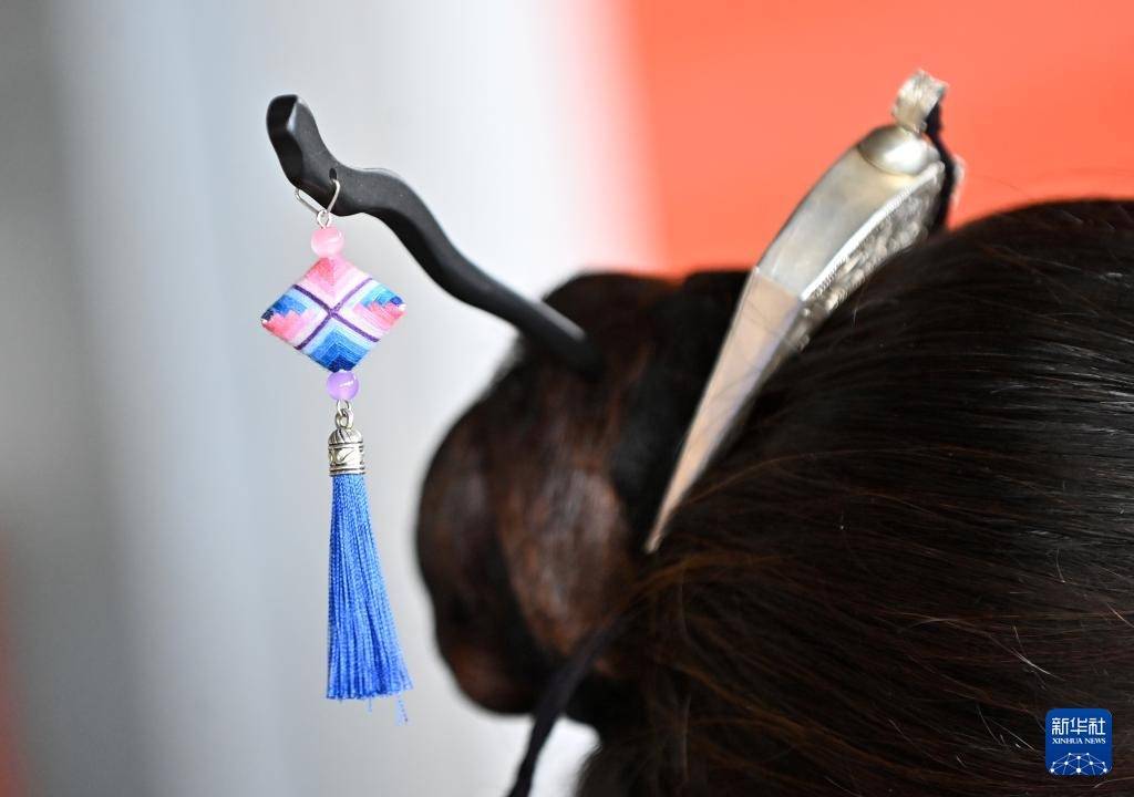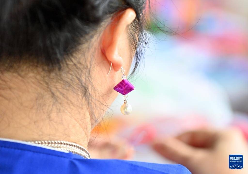 r9月24日,在广西三江侗族自治县八江镇三团村,当地村民佩戴侗族吉祥花耳饰。