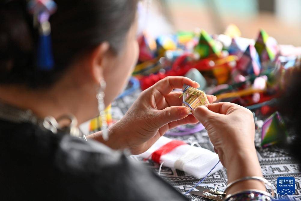 r9月24日,在广西三江侗族自治县八江镇三团村,当地村民制作侗族吉祥花。