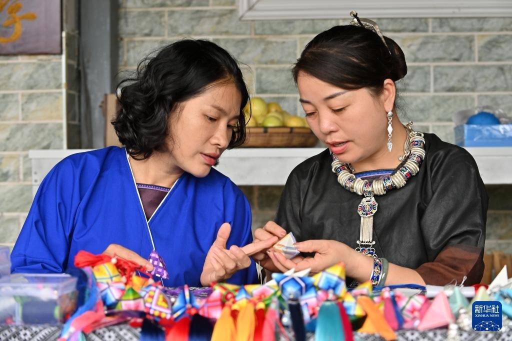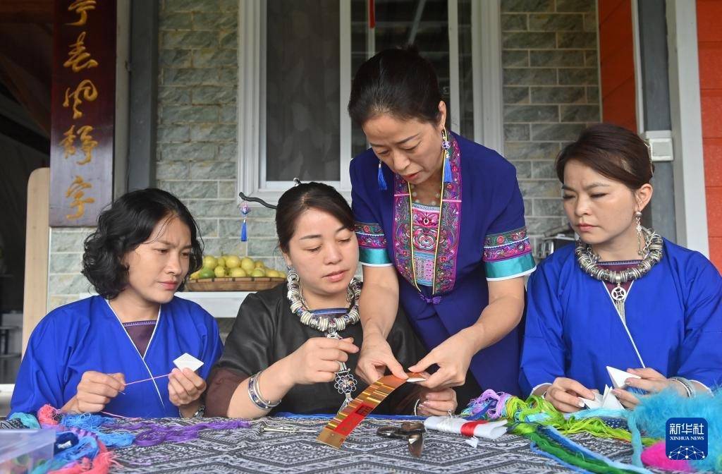 r9月24日,在广西三江侗族自治县八江镇三团村,当地村民探讨侗族吉祥花制作技艺。